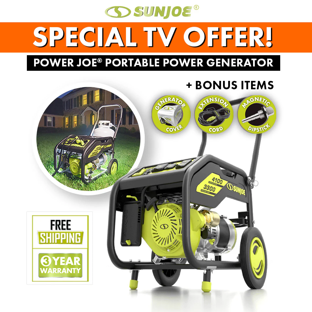 WHEN THE POWER'S GONE, POWER JOE® ON. When you suddenly lose power, life stops. Keep the power on with your home's hero: the Portable Propane Generator from Power Joe, by Sun Joe®. No more struggling with bulky, smelly gas generators. If you can start your BBQ, you can turn on Power Joe — just press one button! In a blackout, Power Joe gives you instant, reliable access to exclusive PRO POWER3X technology: PowerSTART, PowerCOOL, and PowerFUEL.