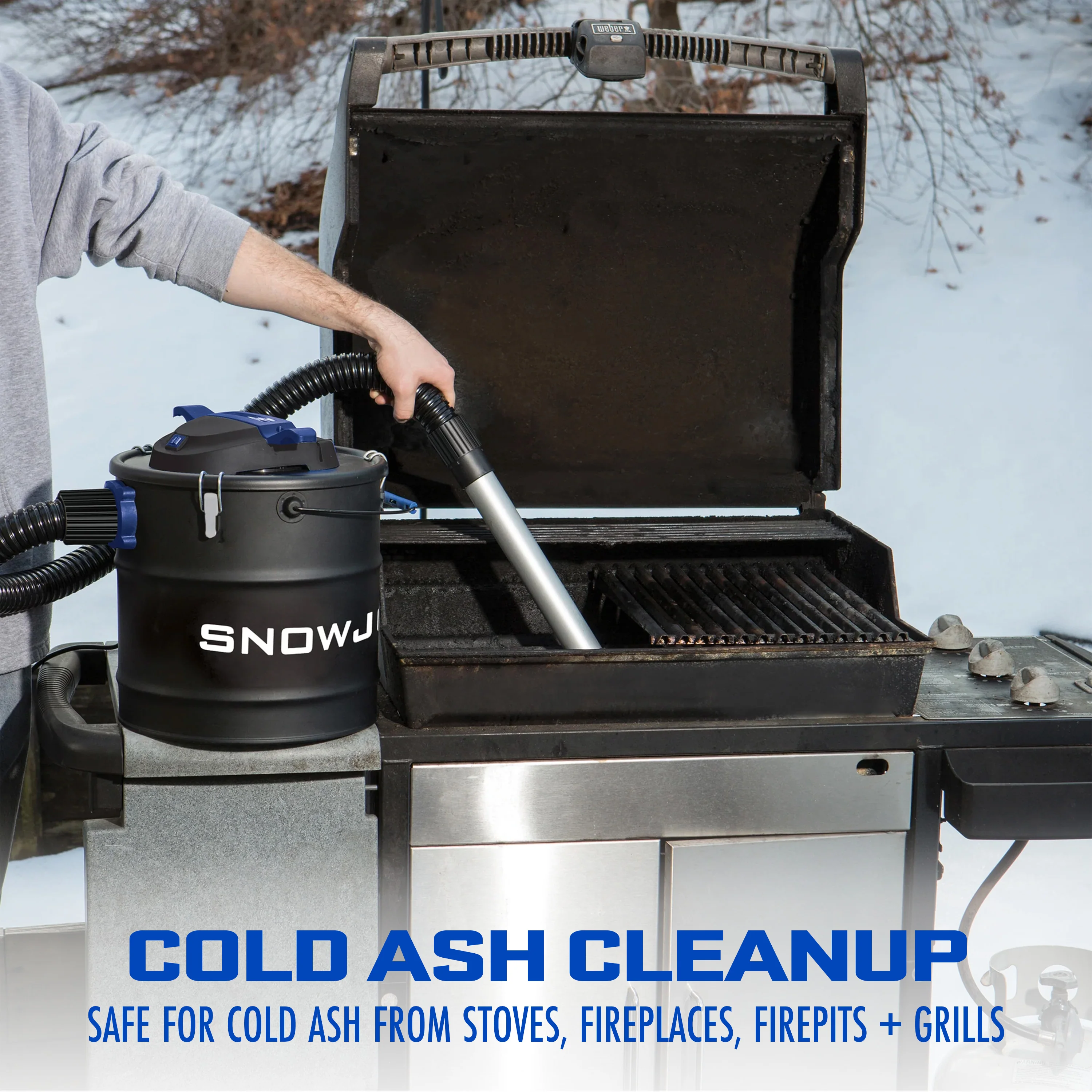 ASH IT OUT. The Snow Joe® ASHJ202E 5 amp 4.8-gallon Ash Vac is designed for cold ash pickup from wood stoves, pellet stoves, fireplaces, fire pits, and BBQ grills. Equipped with a dual filtration system that employs both a coarse-dust pre-filter and a fine-dust pleated filter, the Ash Vac effectively traps dust particles during the ash cleaning process and prevents them from escaping into your breathing space. No more dusty mess around your home! Operation is simple: just insert the Ash Vac’s aluminum intake nozzle into your pile of cold ash, flip the switch, and watch its powerful 5-amp motor generate up to 500 W of suction power and 42.4 cubic feet per minute of air flow. The Ash Vac’s extra large metal canister stores up to 4.8 gallons of ashes, so you can finish your task without stopping to empty the container. Plus, it’s a self-contained, bag-free system, which allows for easy ash removal with a simple lift of the container lid. Other features include a safety stop switch to prevent the Ash Vac from operating without a properly fitted filter, a wire filter basket to protect the fine dust filter, an easy carry handle, an inspection window blockage indicator, and an onboard cord/hose organizer for convenient storage. Backed by a full 2-year warranty, the Ash Vac ASHJ202E is the reliable cleanup tool you’ll need to deal with any ash problem in a simple, clean and safe way.